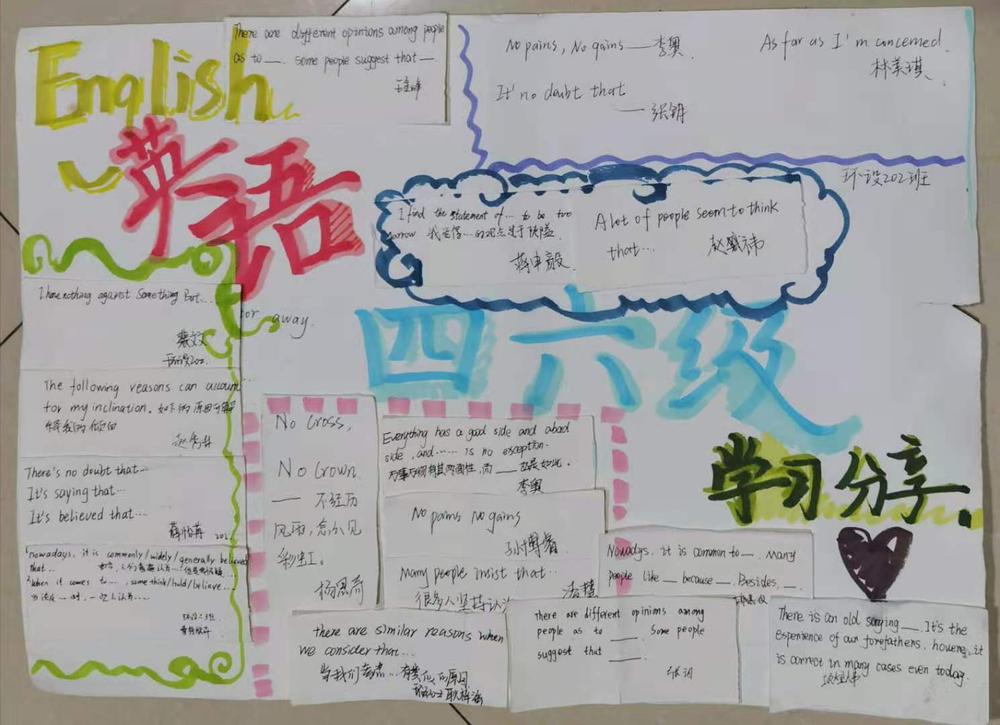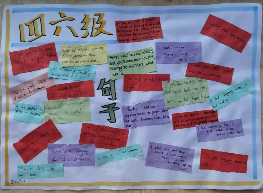 为激发同学们的学习热情,备战四级考试,在四六级经验交流分享会结束后,beat365团委发起了征集四级写作句子手抄报活动。同学们踊跃参加,并将这份热情投入到备战英语四级考试的复习中。截至11月22日共征集到来自30班的30个作品。