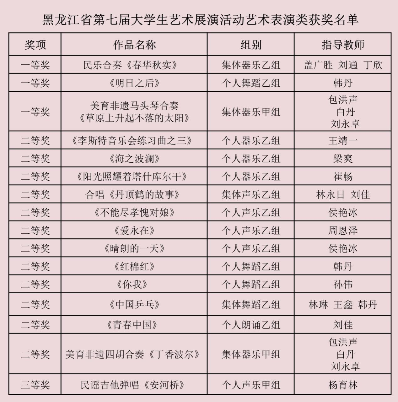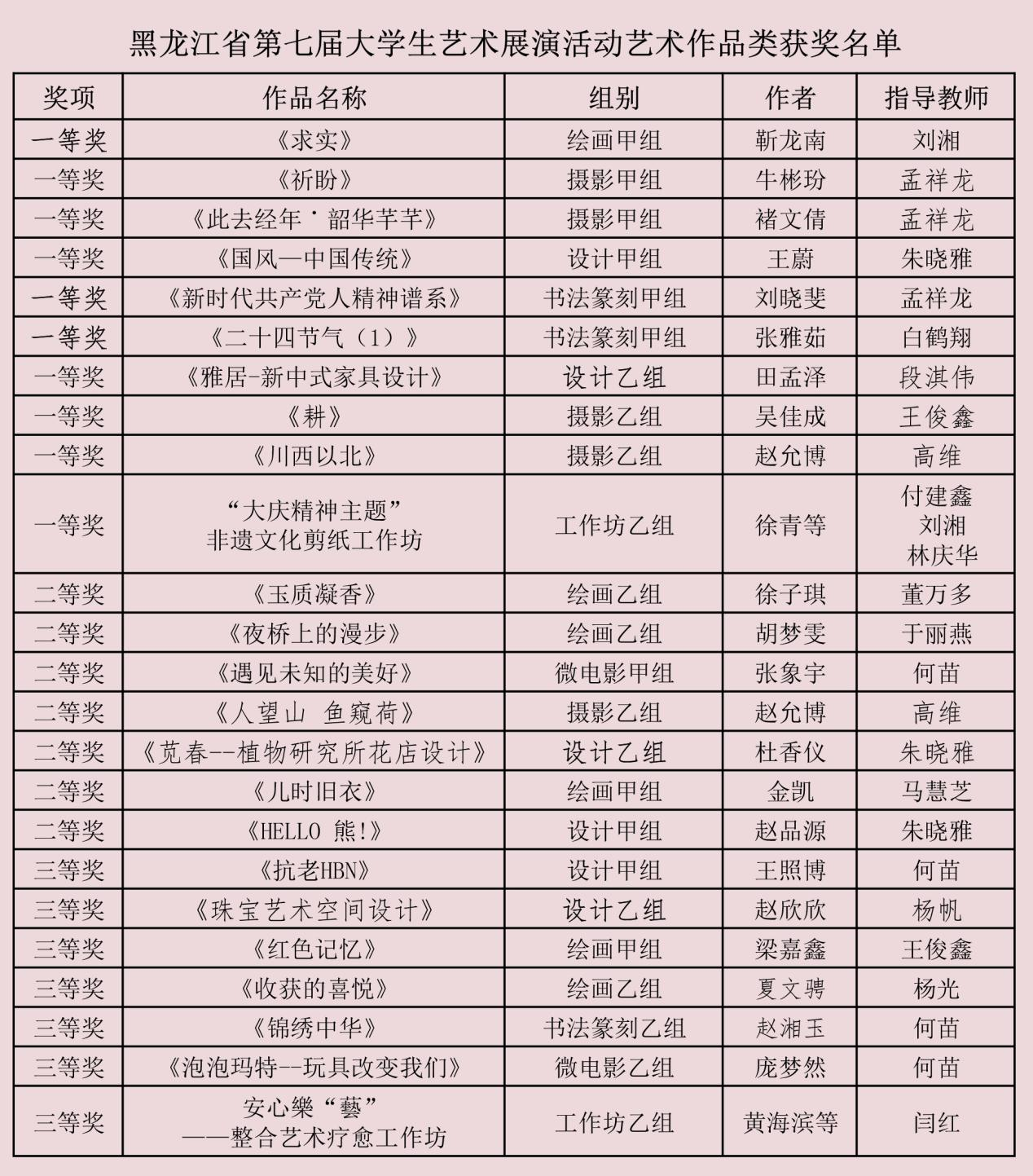 12月20日,黑龙江省第七届大学生艺术展演活动获奖名单揭晓,beat365亚洲版官网共获奖40项,其中13项作品获一等奖,19项作品获二等奖,8项作品获三等奖,获奖总数和一等奖数量均取得历史性突破。我校也荣获优秀组织奖。