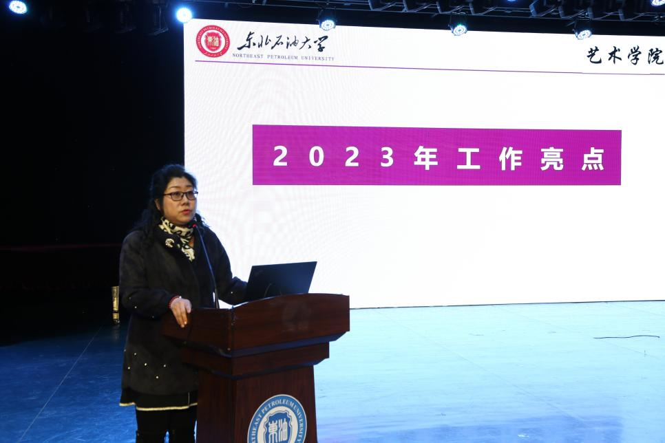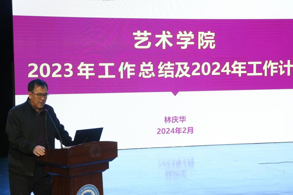 会议首先由院长林庆华为全体教职工做工作报告,对学院2023年工作进行通报、对新学期工作进行部署。她重点介绍了学院2023年工作亮点,一是高质量完成学科审核评估工作,并以16票全票顺利通过国务院学位委员会艺术学学科评议组专家评审;二是以艺术特有的方式助力大庆精神办学育人。接着从党建工作、教学工作、学科建设与科研工作、美育工作、学生工作、铁人诞辰一百周年专题活动、院办工作等七个方面叙述2023年学院的工作成绩。然后围绕beat365亚洲版官网本学期重点工作、教学科研重点工作、各系重点工作、三中心重点工作四个方面提出新学期工作要点。最后再次强调了beat365亚洲版官网本学期的十项重点工作,对本科教学评估院内自评、音乐剧《铁人在非洲》演出、本科毕业设计、研究生毕业答辩、本科生毕业展演、美育教学成果展演、模拟面试工作室、毕业生就业帮扶行动、邀请专家进校学术报告、综合常毕业晚会等十项重点工作做了具体部署,为全院上下提供了明确的指导和工作思路。